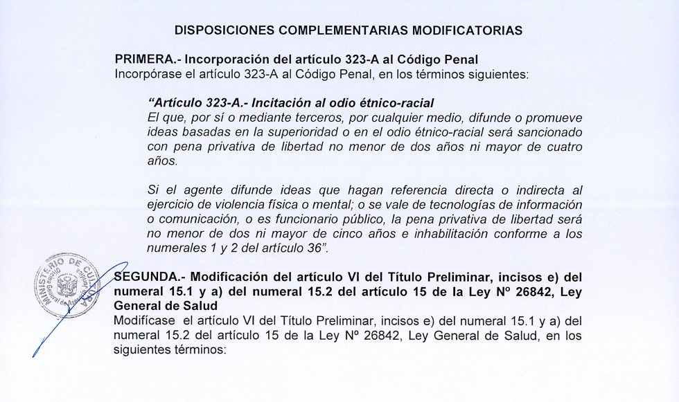 Al Gobierno, por su parte, parece importante muy poco poner los puntos sobre las íes para sancionar el racismo. En enero del 2019, la gestión Vizcarra presentó un proyecto de ley para crear el delito de Incitación al odio racial, con una sanción máxima de hasta cuatro años de prisión. La propuesta no fue una iniciativa del Gobierno, sino obedeció a una recomendación del Comité para la Eliminación de la Discriminación Racial de las Naciones Unidas.