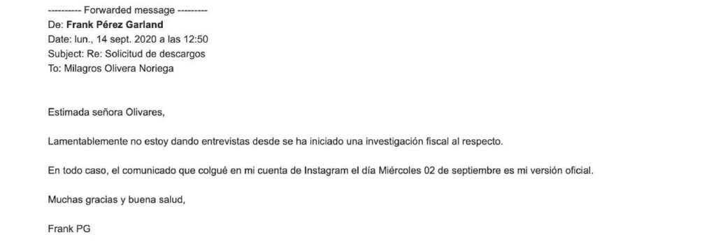 Quien escribe este texto se contactó con Frank Pérez-Garland. Él respondió que no está dando entrevistas desde que se inició la investigación fiscal relacionada a las denuncias de acoso, pero que su versión oficial es la que aparece en el comunicado de Instagram difundido el día miércoles 02 de septiembre.