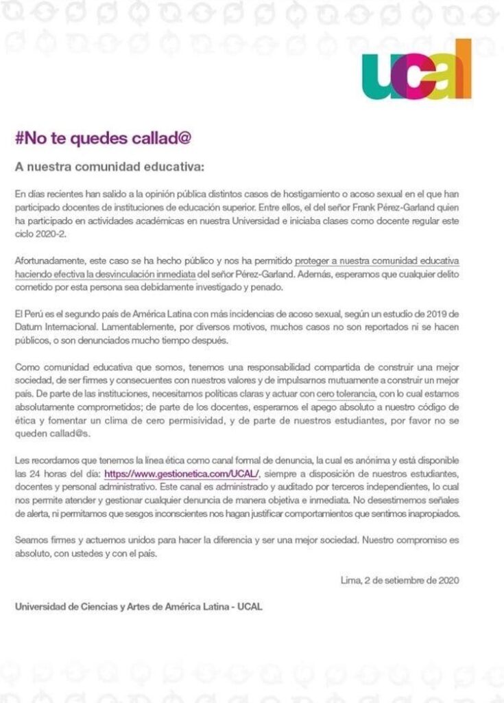 La Universidad de Ciencias y Artes de América Latina (UCAL), a través de un comunicado interno dirigido a la comunidad educativa, titulado “No te quedes callad@”, manifestó haber hecho “la desvinculación inmediata del señor Pérez-Garland”. Según mencionan, afortunadamente “este caso se ha hecho público”, sugiriendo que desconocían estas prácticas. Aseguran tener “una responsabilidad compartida de construir una mejor sociedad”. “Necesitamos políticas claras y actuar con cero tolerancia, con lo cual estamos absolutamente comprometidos”. Y agregan: “Les recordamos que tenemos la línea ética como canal formal de denuncia, la cual es anónima y está disponible las 24 horas del día”.