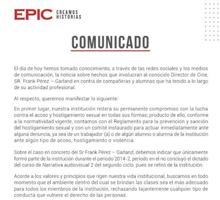 La Escuela de Cine y Artes Visuales de Lima (EPIC), donde Frank Pérez-Garland fue docente, también ha emitido un comunicado afirmando que cuentan con un reglamento “para la prevención y sanción del hostigamiento sexual, y con un comité instaurado para actuar inmediatamente ante alguna denuncia, ya sea de un trabajador o de algún alumno o alumna de la institución ante algún tipo de acoso, hostigamiento o violencia”.