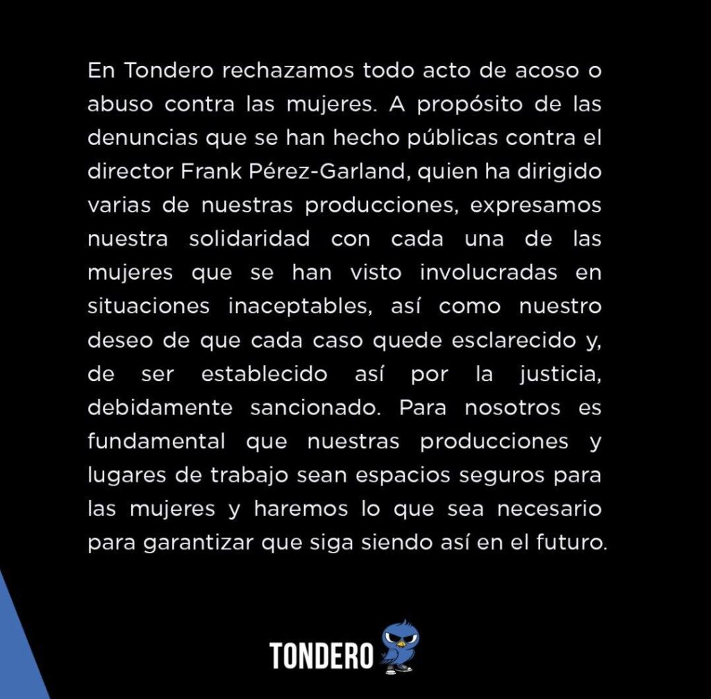 La empresa Tondero, que ha producido numerosos largometrajes de la mano de Frank Pérez-Garland, compartió un comunicado señalando que rechazan “todo acto de acoso o abuso contra las mujeres”. Expresaron, a propósito de las denuncias, su solidaridad “con cada una de las mujeres que se han visto involucradas en situaciones inaceptables, y de ser establecido así por la justicia, debidamente sancionado”.