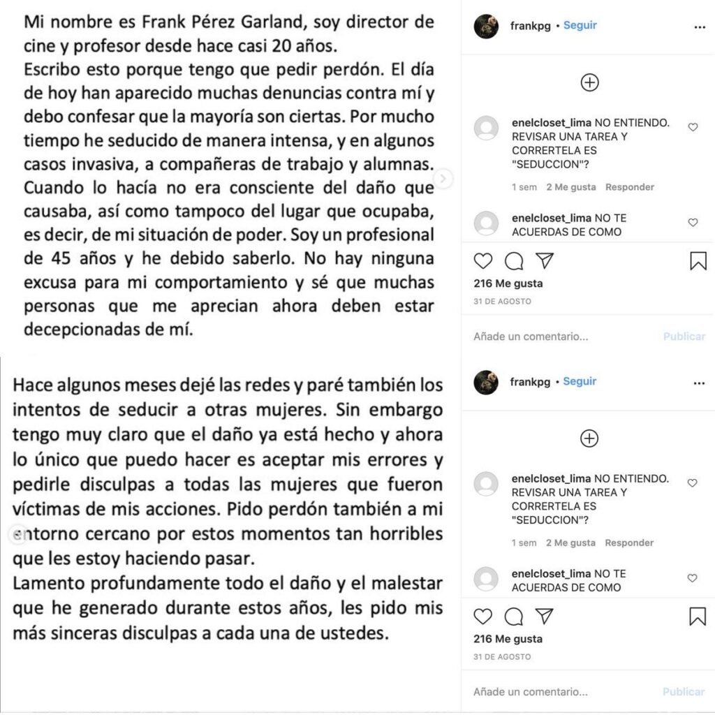 Este mensaje lo publicó en respuesta a las denuncias difundidas por una cuenta de Instagram, que en pocas semanas ha sumado más de 4000 seguidores. La cuenta se llama Acosadores de cine peruano caerán y ha hecho públicas denuncias anónimas que involucran a reconocidos personajes del medio audiovisual. A través de historias, la página compartió los mensajes que les llegaban, sin revelar el nombre de las denunciantes, quienes sindicaban a Frank Pérez-Garland como el responsable de haberlas acosado. En los mensajes, se lee: