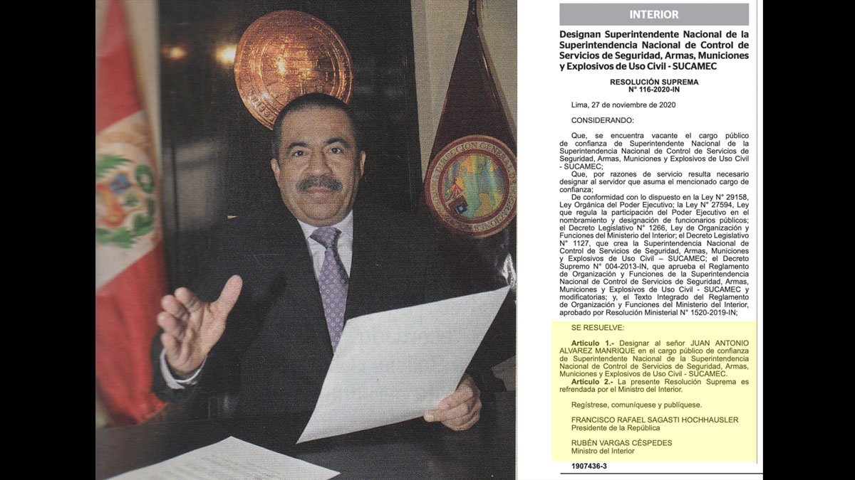 Hoy, sábado 28, el presidente Francisco Sagasti y el ministro del Interior Rubén Vargas nombraron jefe de la Sucamec al general retirado de la Policía Juan Antonio Álvarez Manrique. El nuevo superintendente asume el cargo dejado por Carlos Tuse Lloclla, quien renunció en octubre de este año tras ser denunciado por acoso sexual contra una de las funcionarias de Sucamec, como reportó EL FOCO.
