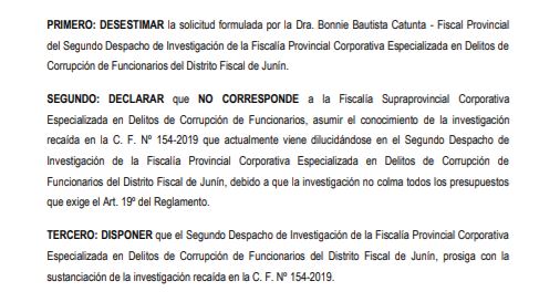 «Bajo dicho panorama, la citada investigación no podría ser asumida en dichas condiciones por una Fiscalía Supraprovincial con competencia nacional, dado que, si eso sucediera, se podría afectar de manera negativa la estrategia de investigación que se diseñó y el éxito de la investigación en sí misma», expresa Tello.