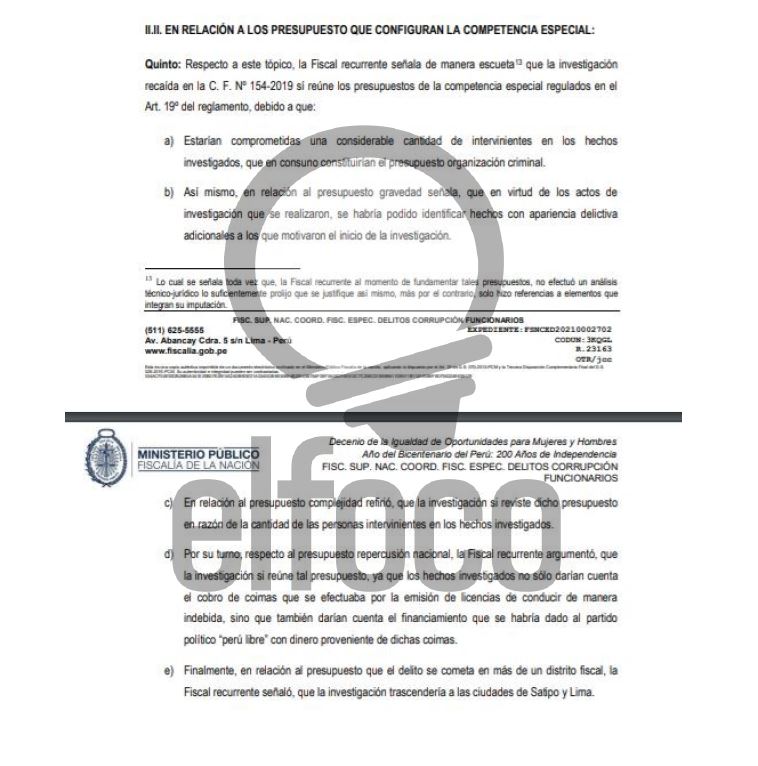 En el oficio, al que tuvo acceso EL FOCO, la fiscal Bautista señaló que el caso tiene repercusión nacional debido a que no se limita al cobro de coimas para emitir irregularmente licencias de conducir en la Dirección Regional de Transportes y Comunicaciones (DRTC) de Junín sino que también abarca el financiamiento ilícito de Perú Libre, partido político que ganó las elecciones presidenciales.