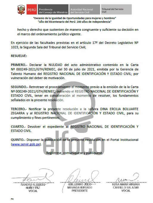 Tras una apelación de Boluarte, el presidente de la Segunda Sala del tribunal, Guillermo Miranda Hurtado, y los vocales Sandro Nuñez Paz y Rosa María Carrillo Salazar ordenaron a Reniec emitir un nuevo pronunciamiento por falta de motivación, según la resolución a la que accedió EL FOCO. Sin embargo, también cuestionaron los argumentos del Reniec para rechazar el pedido.