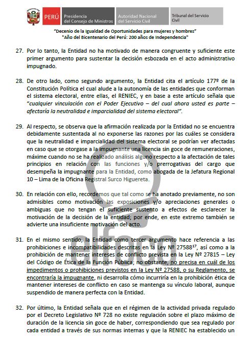 El Tribunal de Servir indicó que Reniec no analizó si las labores del cargo específico que ocupa Boluarte como jefa de la Oficina de Surco también afectan esa neutralidad. Además, Servir indica que la licencia implica una suspensión perfecta de labores, por lo cual la vicepresidenta no estaría ocupando dos cargos a la vez.