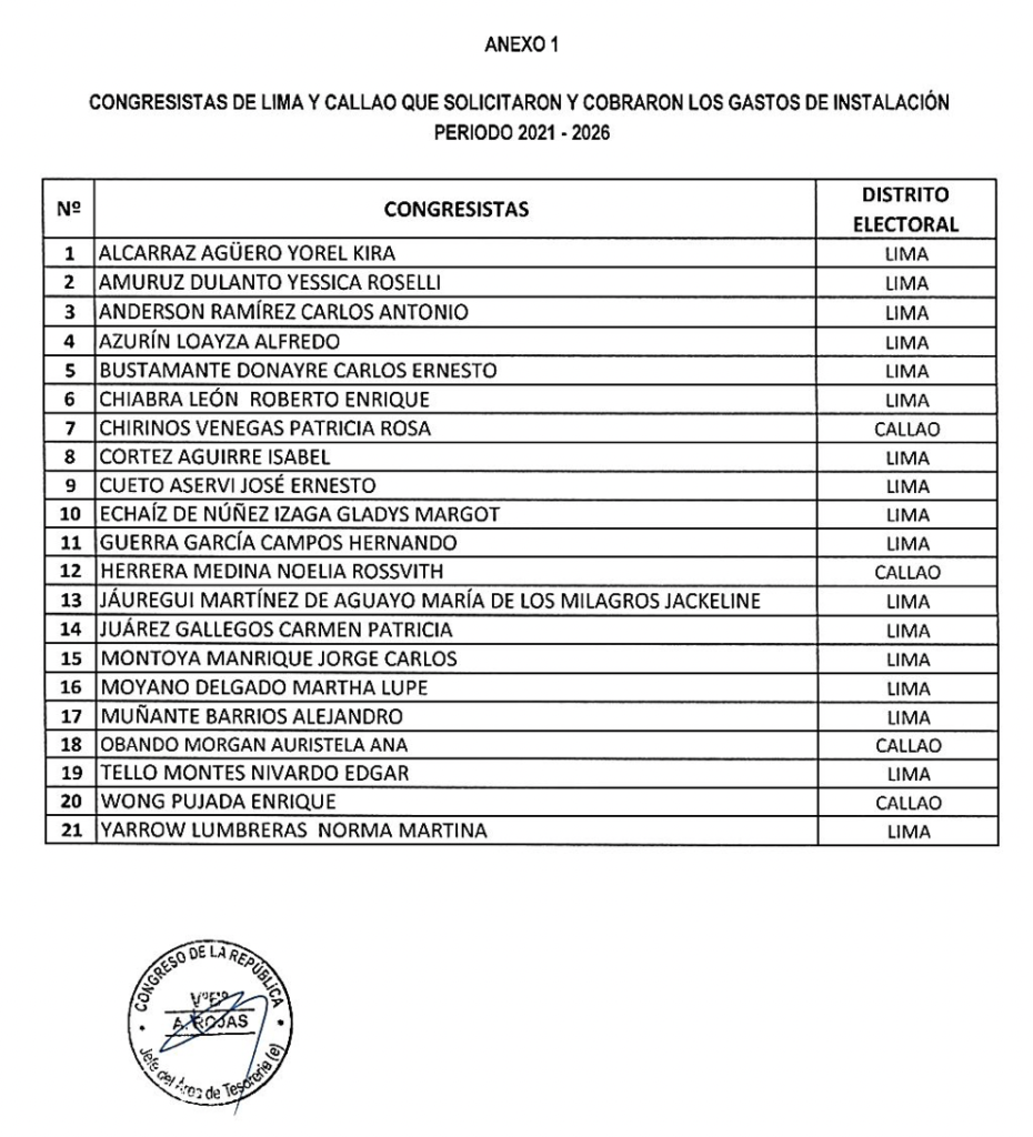 La lista de los congresistas de Lima y Callao que solicitaron hasta inicios de septiembre dicho abono es copiosa. Se trata de 17 de los 33 parlamentarios electos por Lima, y 4 de los 5 parlamentarios representantes del Callao. Entre los legisladores que percibieron los gastos de instalación figuran: Jorge Montoya, José Cueto, Noelia Herrera, María Jáuregui, Alejandro Muñante de Renovación Popular. De Fuerza Popular aparecen: Hernando Guerra, Ernesto Bustamante, Patricia Juárez, Martha Moyano y Auristela Obando.