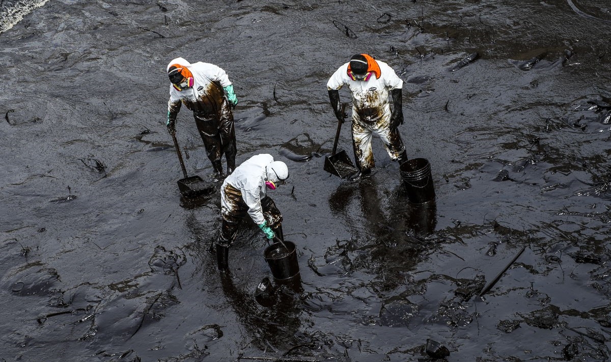 Estos días, quienes llegan temprano a Cavero junto con Walter, son las decenas de personas que conforman las cuadrillas de limpieza. Como Juan, trabajador de construcción, que entró por un conocido. Se pone el traje blanco, la máscara de dos válvulas, botas y guantes y lanza un balde vacío desde el acantilado hacia la playa, que regresa lleno de petróleo. Lo pasa a sus compañeros y ellos lo depositan en algunos baldes más grandes y luego a los cilindros. Algunos solo usan mascarillas quirúrgicas. Abajo en la caleta, unas diez personas recogen el petróleo de la arena y también lo depositan en cilindros. Es así como extraen los miles de litros derramados. Balde a balde. Desde el acantilado se ve una poza de lodo negro. El olor es intenso, y después de un rato marea y duele la cabeza.