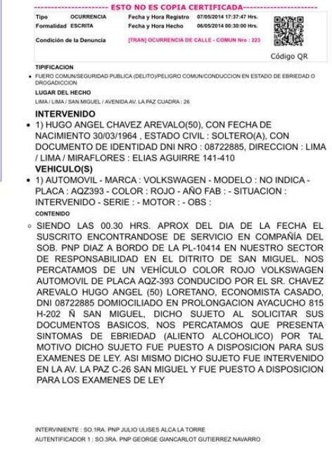 Parte policial de 7 de mayo del 2014 dando cuenta de la detención de Hugo Chávez Arévalo mientras conducía en estado de ebriedad.