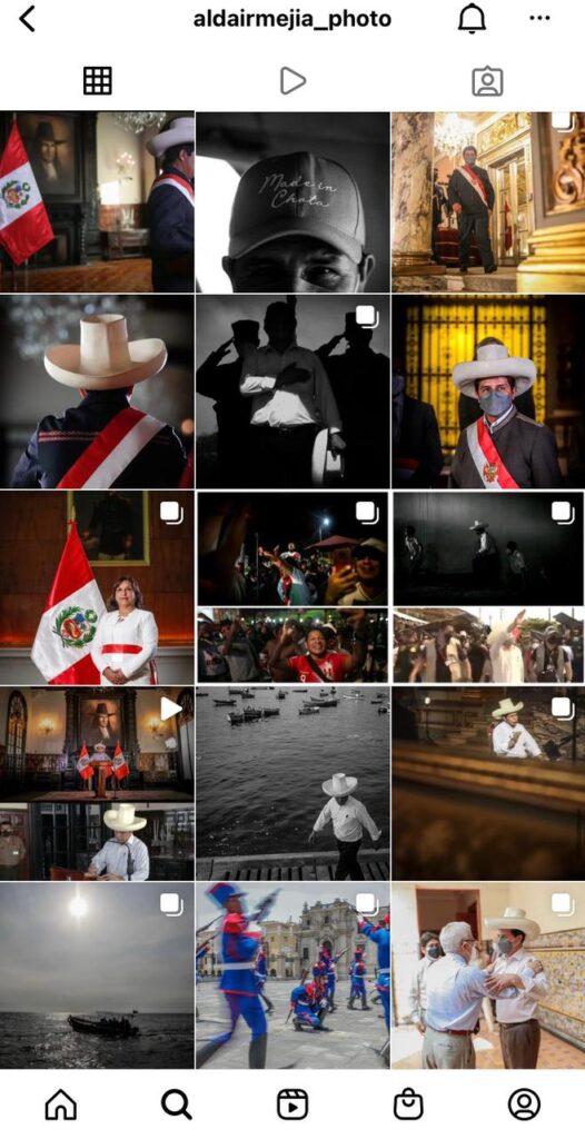 Diversas fotografías del presidente Pedro Castillo, por ejemplo, se encuentran en la cuenta personal de Instagram del fotógrafo Aldair Mejía, uno de los que presta servicios para Palacio de Gobierno. Esas imágenes no están en los archivos del Despacho Presidencial, ni aparecen en las galerías de las entidades públicas que son de acceso general para cualquier peruano o periodista.