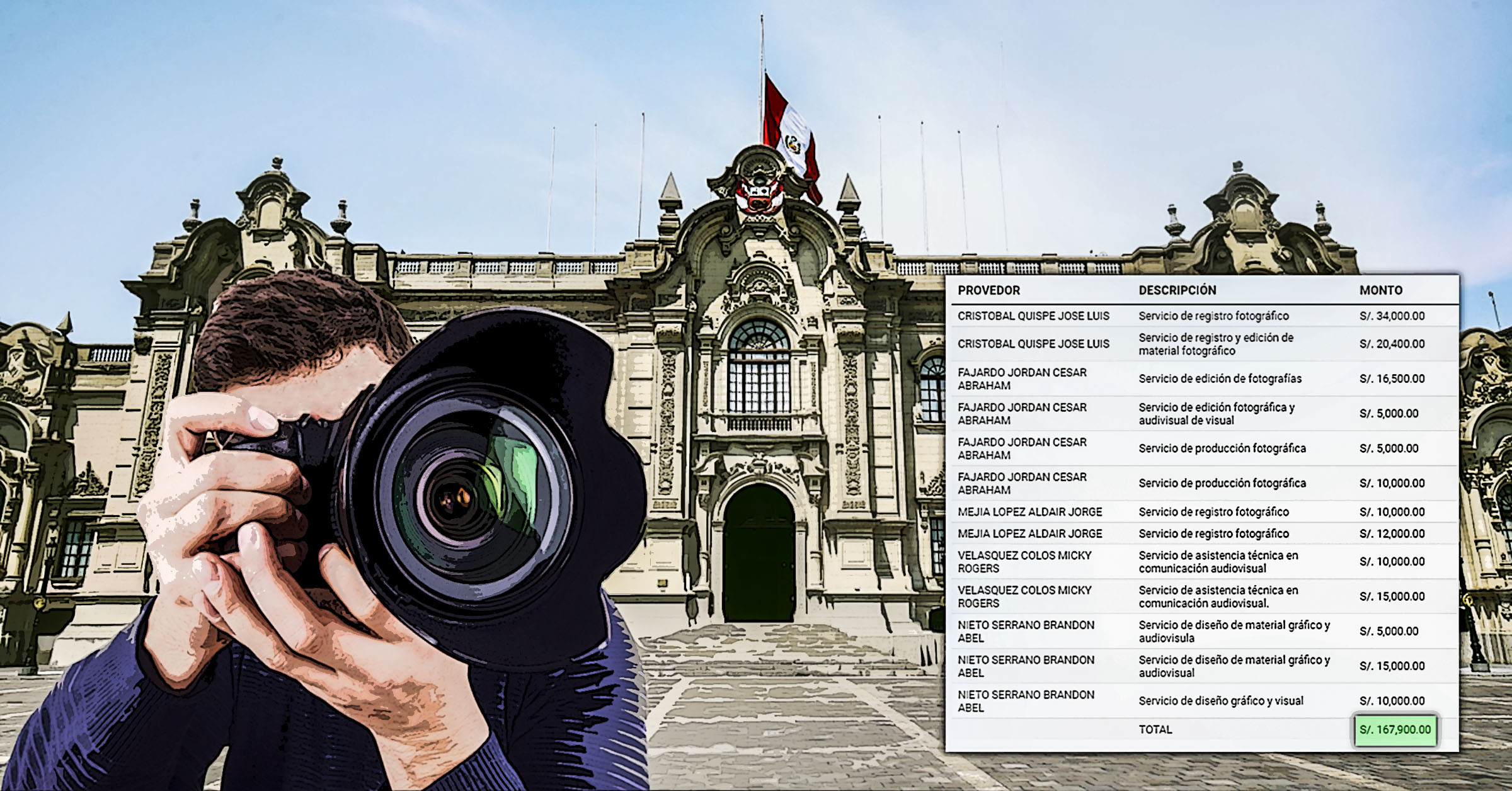 Entre los fotógrafos que han sido contratados por Palacio de Gobierno se encuentran César Abraham Fajardo Jordan, quien desde agosto ha emitido órdenes por un total de S/36 500; José Luis Cristóbal Quispe, conocido por haber acompañado a Castillo durante la campaña electoral; además de los fotógrafos y diseñadores Aldair Mejía López, Micky Velásquez Colos y Brandon Nieto Serrano.