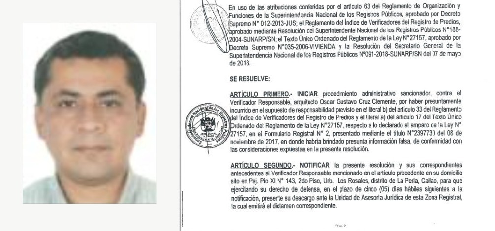 El verificador que legalizó el edificio de Sánchez fue el arquitecto Óscar Cruz Clemente, cuyo nombre aparece en los papeles de Sunarp. Cruz guarda en su historial una investigación en Registros Públicos del 2018, el mismo año en que autorizó la inscripción del edificio de Sanchez. “El arquitecto Oscar Gustavo Cruz Clemente, habría incumplido con su función de declarar con veracidad, respecto a la concordancia entre la realidad física y la información contenida en la documentación presentada ante el Registro, del mismo modo, habría incumplido con su obligación de cumplir con sus funciones actuado con diligencia, buena fe verdad y honestidad”, dice la Resolución Jefatural N°352 de la Sunarp.