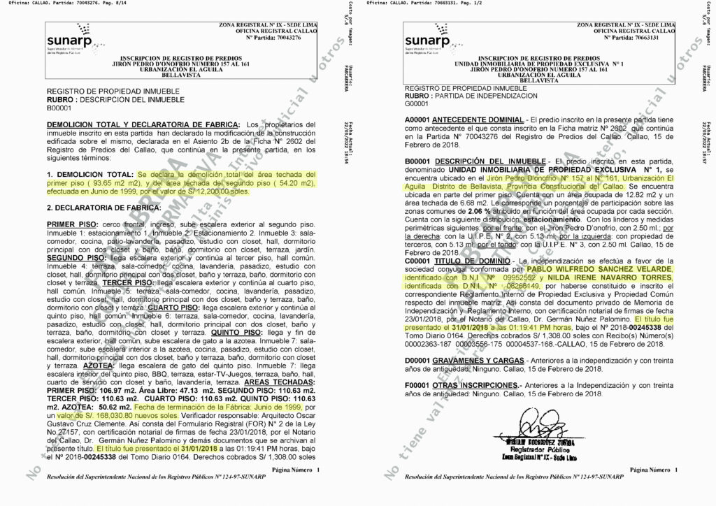 Izquierda: declaración ante Sunarp de la demolición, supuestamente en el 1999, de la casa del fiscal Pablo Sánchez en Bellavista. Derecha: inscripción de independización de uno de los departamentos que se construyó sobre el predio.