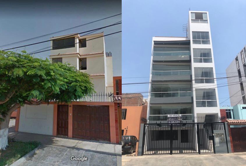 Izquierda: foto de Google Maps, tomada en el 2013, donde se ve la propiedad del fiscal Pablo Sánchez, en Bellavista, antes de la demolición. Derecha: edificio construido, en el 2017, por el titular del Ministerio Público.