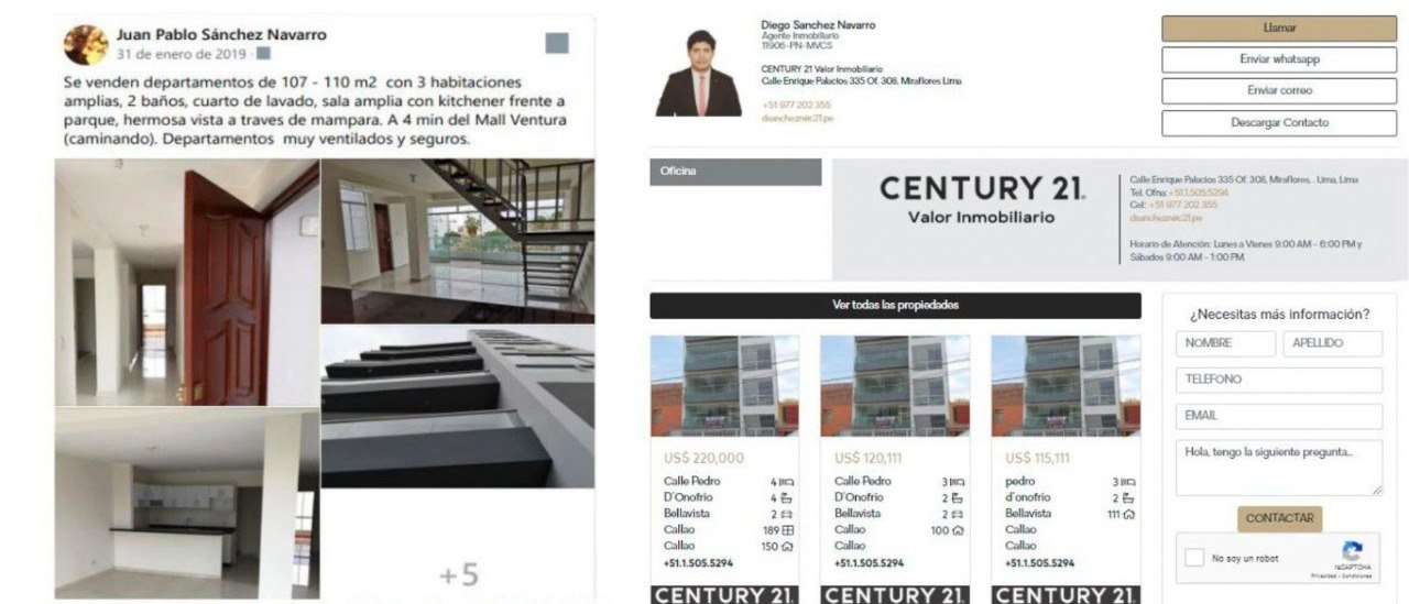 Izquierda: publicación de Facebook de Juan Pablo Sánchez Navarro y en Century 21 de Diego Sánchez Navarro, hijos del fiscal de la Nación, ofertando los departamentos del edificio de Bellavista.