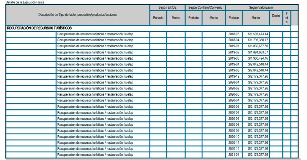 Es a través de Copesco que se suscribió en el 2018 un convenio entre Mincetur y Cultura para cautelar la infraestructura de la fortaleza de Kuelap. Las ordenes de servicio y los contratos, por lo tanto, salen desde el Ministerio de Cultura y se financian con dinero del Plan Copesco. Además de los 93 mil soles girados en abril, desde el 2018 la suma de gastos en Kuelap alcanza los S/ 43 millones.