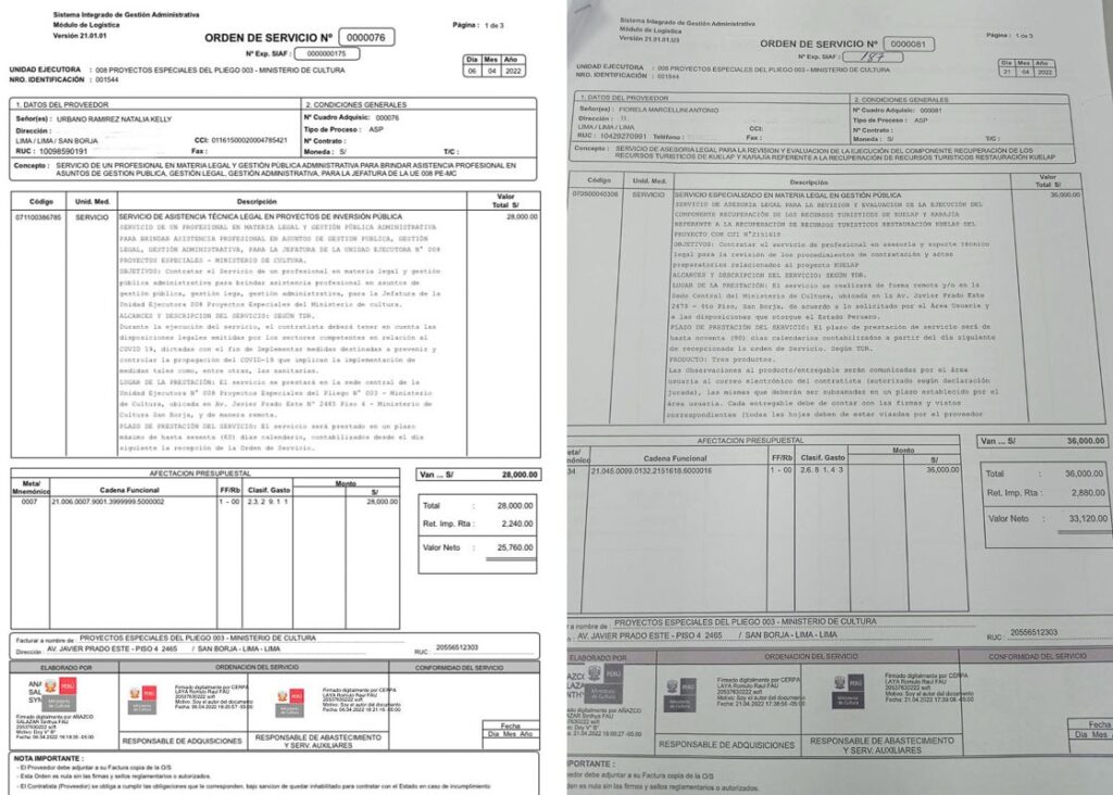 Dos semanas después de la contratación de Urbano, el Ministerio de Cultura pidió los servicios por 36 mil soles, con dinero destinado para el Complejo de Kuelap, de la abogada Fiorela Marcellini para que brinde asesoría legal y revise documentos. La arquitecta Rosío Diaz Ruiz, con un contrato de S/ 19 mil para dar asesoría en conservación, también fue otra de las que prestó servicios, y cuyos sueldo salió de la partida destinada al milenario atractivo turístico.