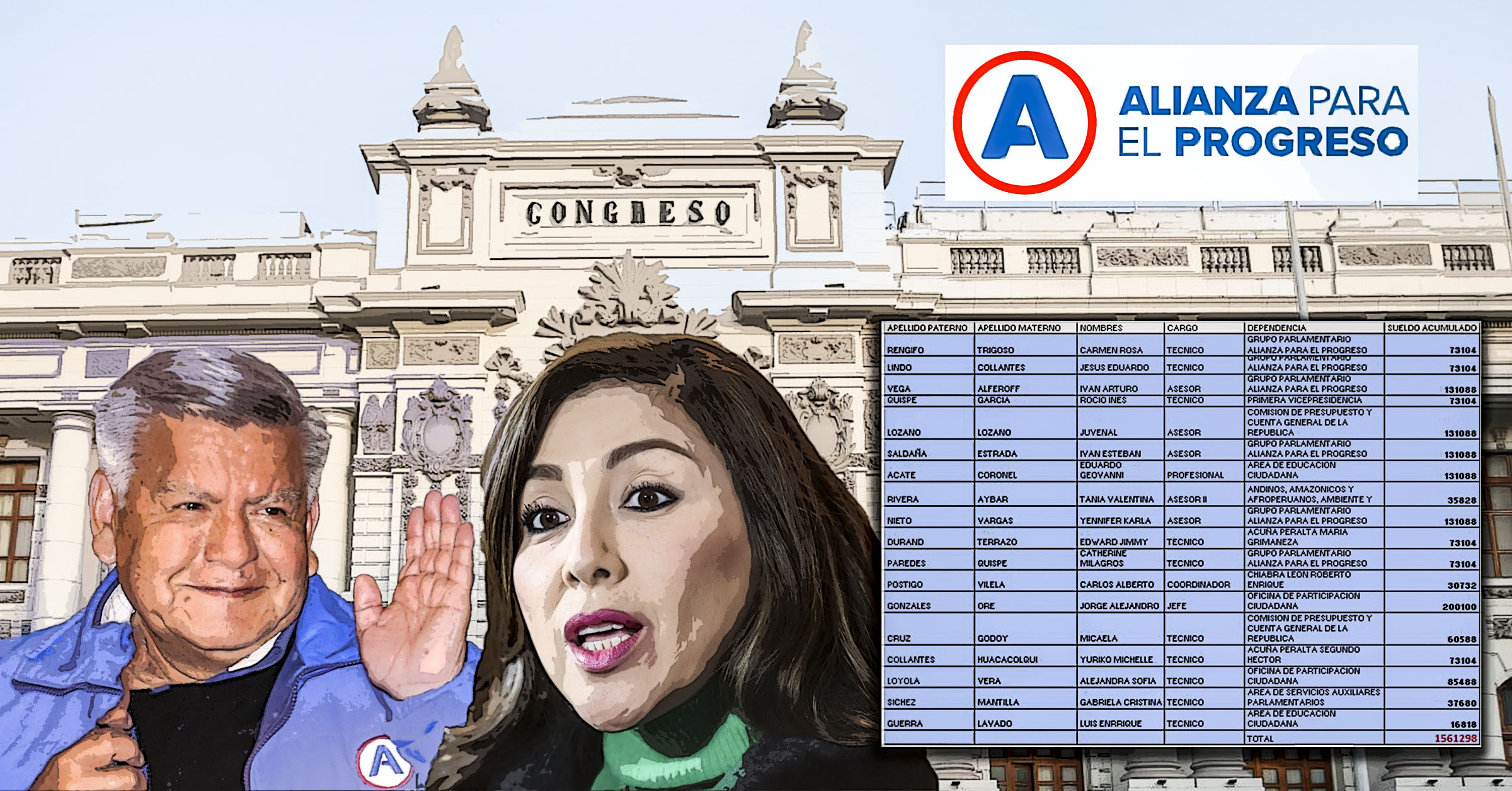 Los hermanos Acuña también han llevado aportantes de APP al llamado “primer poder del Estado”. La congresista Maria Acuña Peralta designó a Jimmy Durand como técnico en su despacho. Durand es afiliado a APP, cobra un sueldo de S/ 6 902 y donó a la campaña de S/ 250. El otro hermano, Héctor Acuña, hoy en la bancada Integridad y Desarrollo, contrató para su despacho a la aportante Yuriko Collantes, bachiller en Comunicaciones por la universidad Cesar Vallejo, también ganando más de seis mil soles. En los sueldo de Durand y Collantes el Congreso lleva ya desembolsado S/ 146 208.