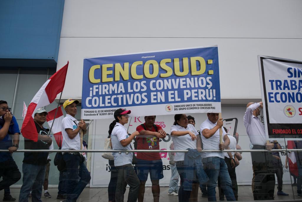 Trabajadores de Cencosud, dueña de Wong y Metro, protestando por mejores condiciones laborales, el 1 de mayo último. "El ministro Fernando Varela, en los 10 arbitrajes donde ha participado, ha logrado que se disminuyan los derechos laborales", comenta Javier Huancahuari, abogado de los trabajadores de Censocud. (FOTO: Miguel Vásquez Vicente)