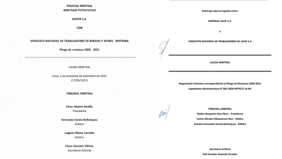 Primera páginas de los laudos arbitrales de Laive y AJE con sus sindicatos de trabajadores. En ambos el actual ministro Antonio Varela defendió los intereses de las empresas.