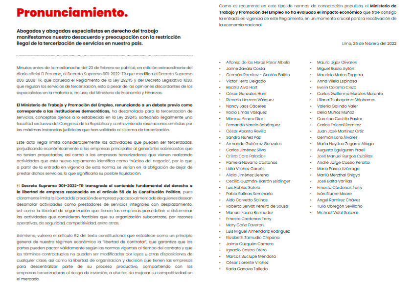 Pronunciamiento en contra de limitar la tercerización, del 25 de febrero del 2022, firmado por abogados laborales que defienden los intereses de las empresas. En la columna de la izquierda, en el número 11, aparece el nombre del ministro Antonio Varela.