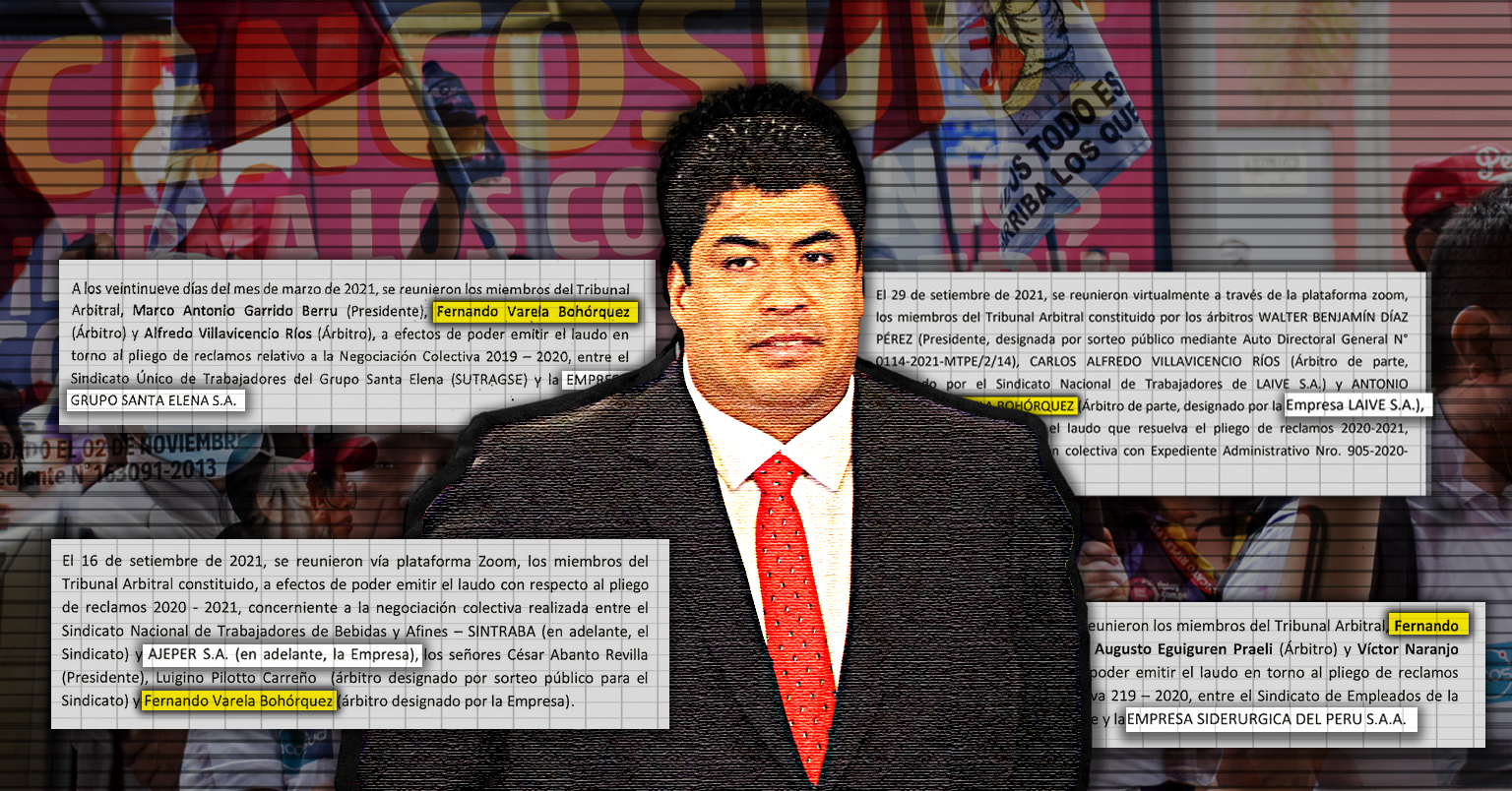 En el legajo reciente del ministro Varela hay 10 arbitrajes donde fue designado por empresas como Gloria, Laive, Tasa, Cencosud y AJE frente a demandas sindicales de mejores condiciones de trabajo y salariales. En 7 de los arbitrajes, la empresa que designó a Varela ganó la disputa. Hay uno caso donde Varela fue arbitro de Cencosud hasta antes de ser ministro que está pendiente de decisión.