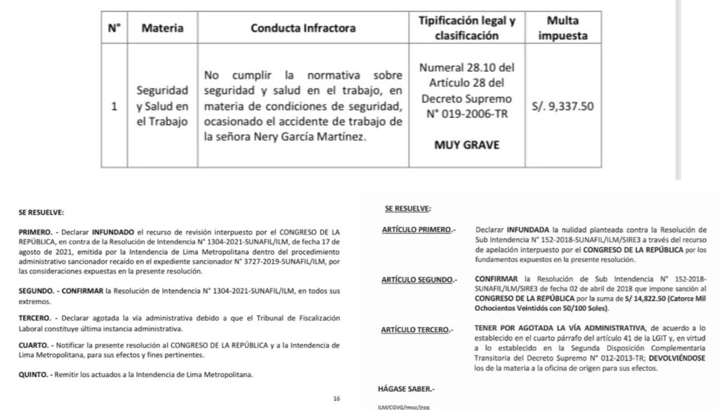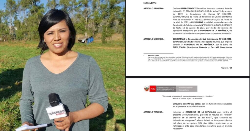 La Superintendencia Nacional de Fiscalización Laboral (Sunafil) ha sancionado al Congreso de la República con S/ 317 110 por maltrato, discriminación y violar las normas de seguridad laboral en perjuicio de tres trabajadoras. Los eventos ocurrieron bajo las presidencias de los fujimoristas Luis Galarreta y Daniel Salaverry, y de Luis Iberico, de APP.