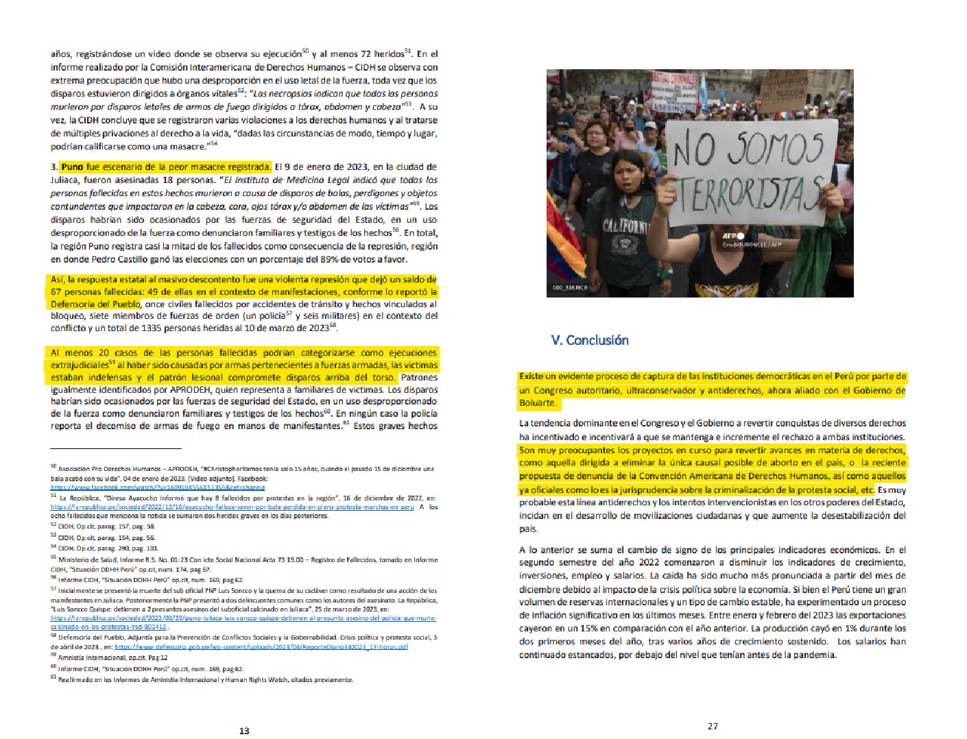 La FIDH, además, señala que hubo «graves violaciones de derechos humanos» cometidos en el gobierno de Dina Boluarte y una estigmatización contra las protestas nacionales. Se identificaron como los lugares que protagonizaron “hechos de violencia y represión desproporcionada” las masacres de Andahuaylas, Ayacucho y Puno, siendo la última “la peor masacre registrada”.