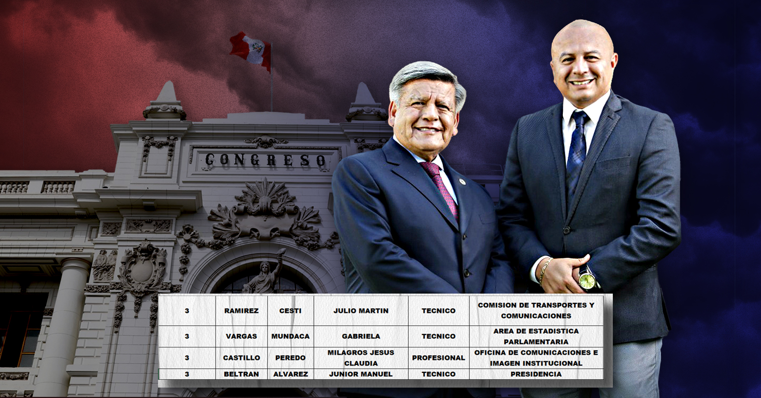 La pareja, el primo, la madre de uno de sus hijos y el asistente de Jair Ramírez, jefe de Comunicaciones de APP y la Universidad César Vallejo, tienen puestos en el Parlamento. Ramírez también ha ganado contratos con el Estado por S/ 83 000.