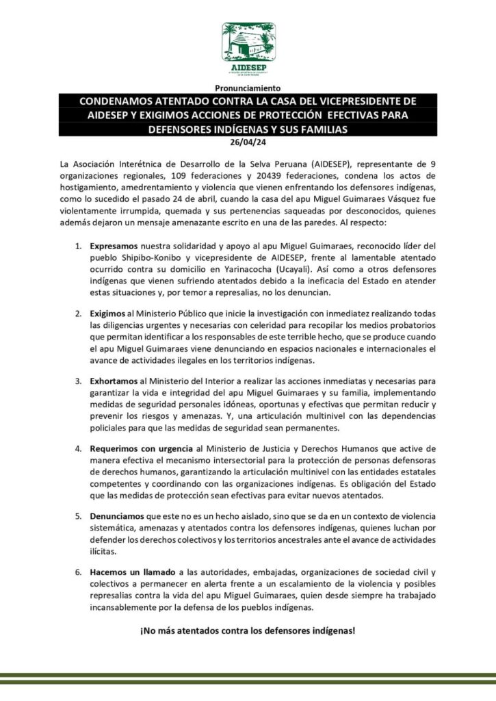 Aidesep condenó el ataque a Guimaraes y alertó que el hecho forma parte de un contexto de violencia al cual se enfrentan los defensores ambientales. “Denunciamos que este no es un hecho aislado, sino que se da en un contexto de violencia sistemática, amenazas y atentados contra los defensores indígenas”, indicaron en un comunicado.
