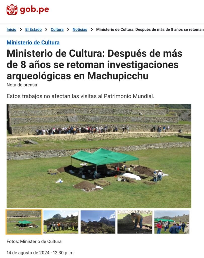 Nota de prensa del Ministerio de Cultura, del 14 de agosto del 2024, informando el reinicio de las investigaciones arqueológicas en Machu Picchu.