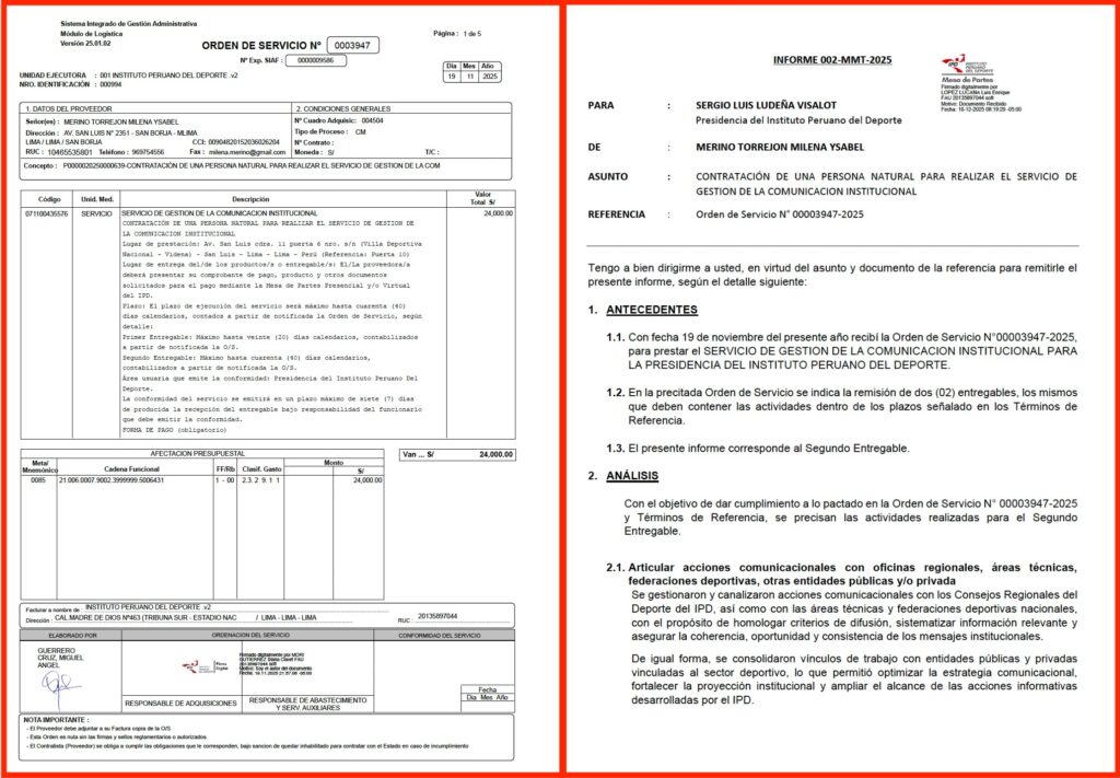 EL FOCO accedió al documento que Merino entregó para justificar el pago de los S/ 24 000. El «entregable», como se conoce al informe, consta de solo 7 páginas, la mayoría de ellas con fotografías del supuesto trabajo que realizó. Según Merino, gracias a sus gestiones, el IPD consiguió 42% más de visibilidad y los Juegos Bolivarianos Ayacucho-Lima 2025 tuvieron un “incremento estimado del 45% en alcance mediático”.
